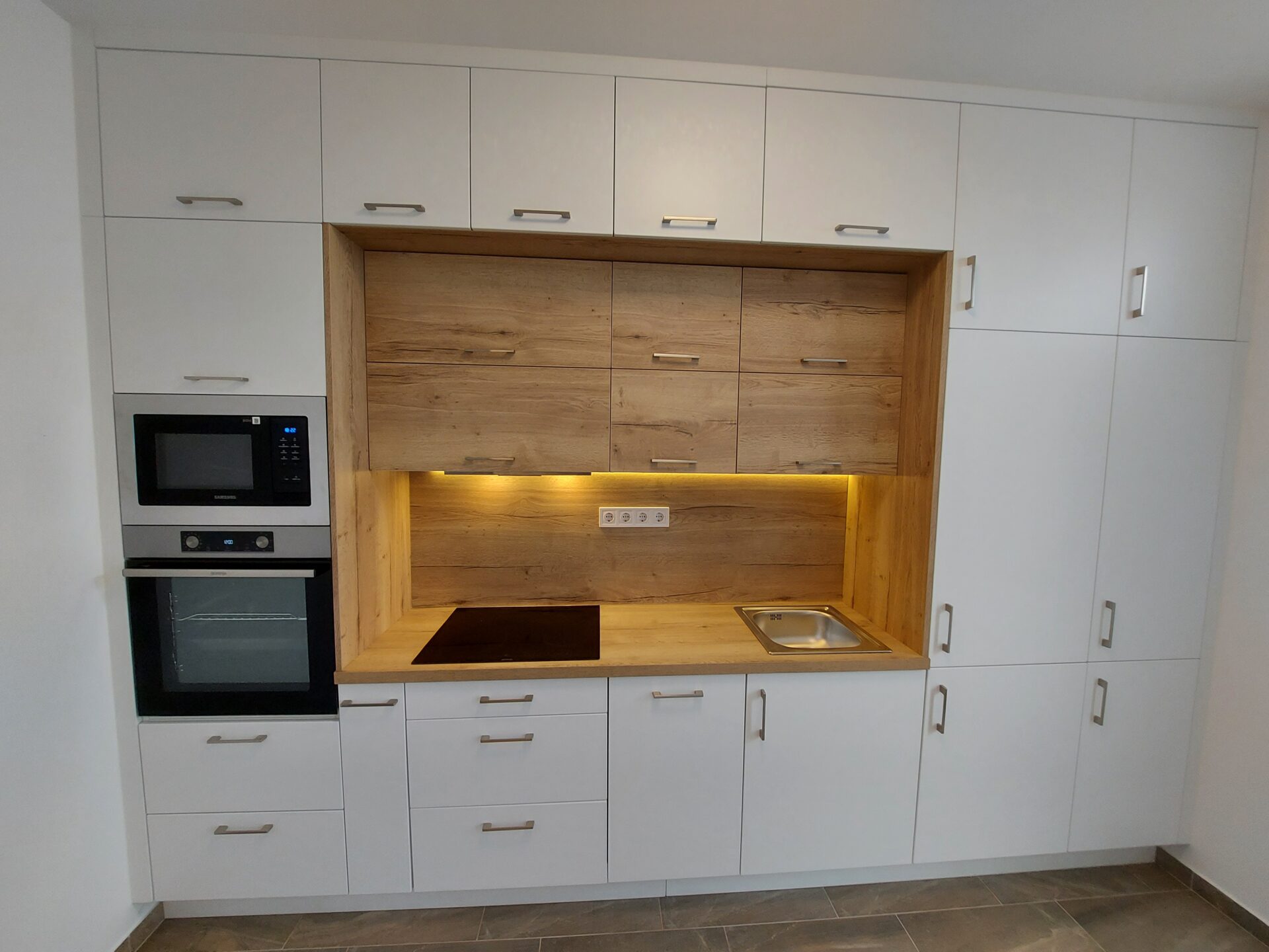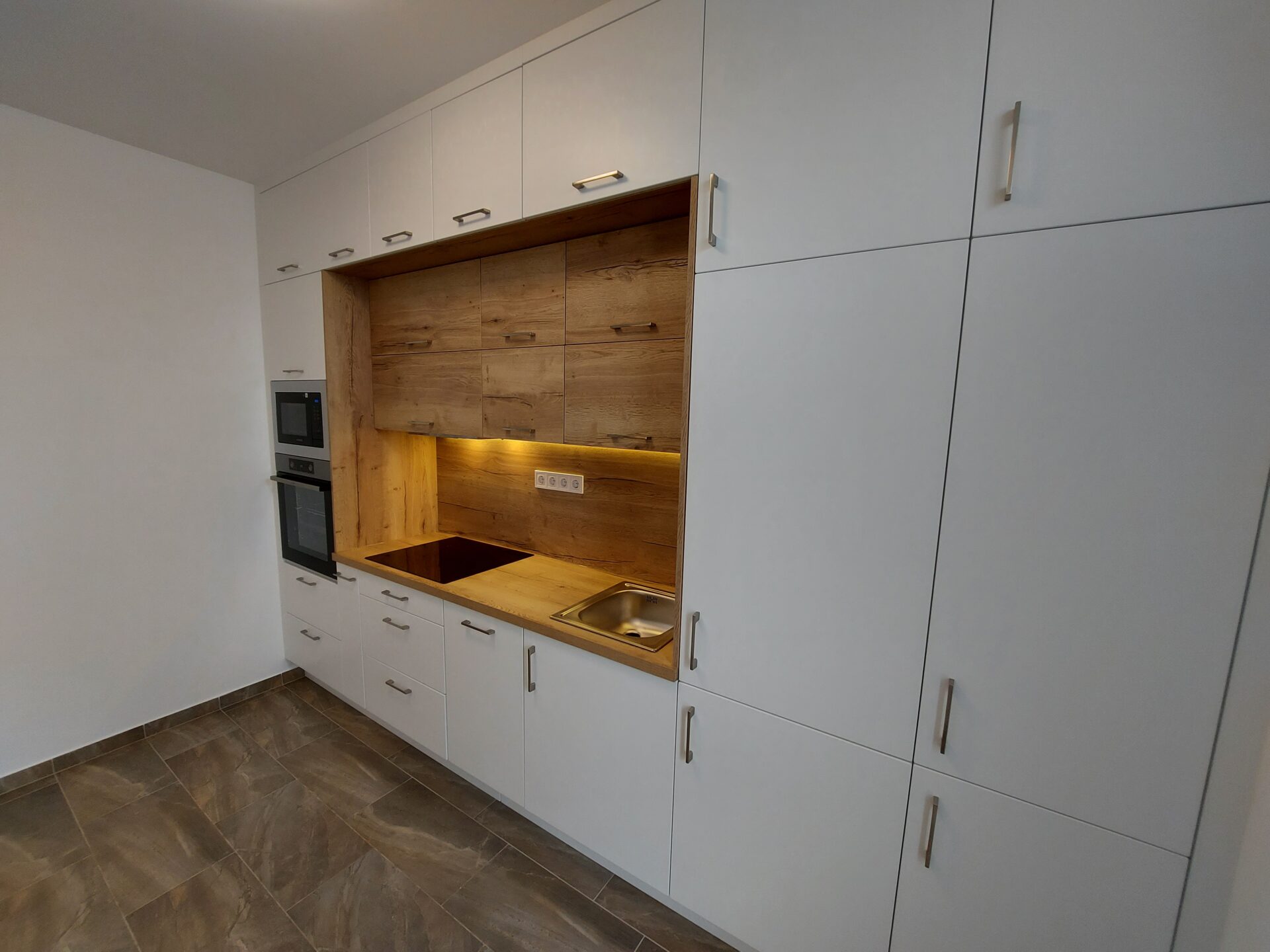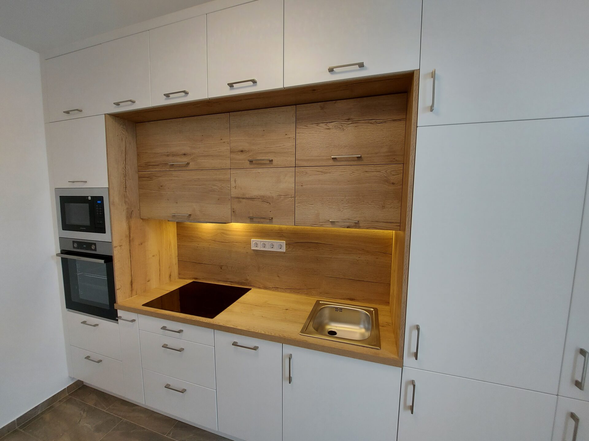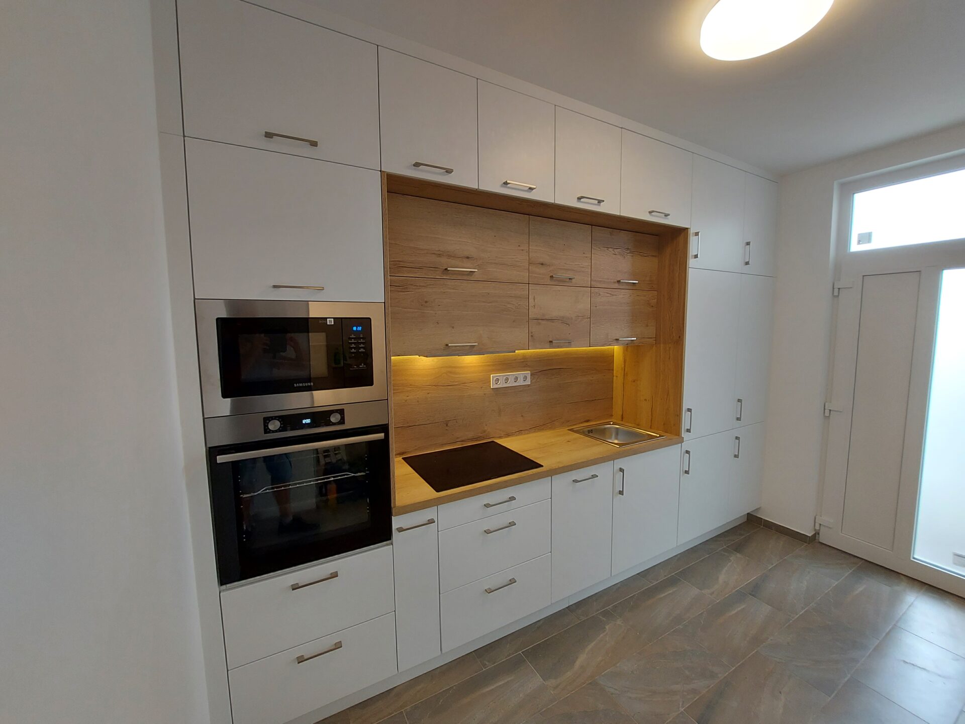Egy kis lakás előszobájának impozáns méretű konyhája. Törtfehér ajtófrontok és tölgymintázat összeállítása.